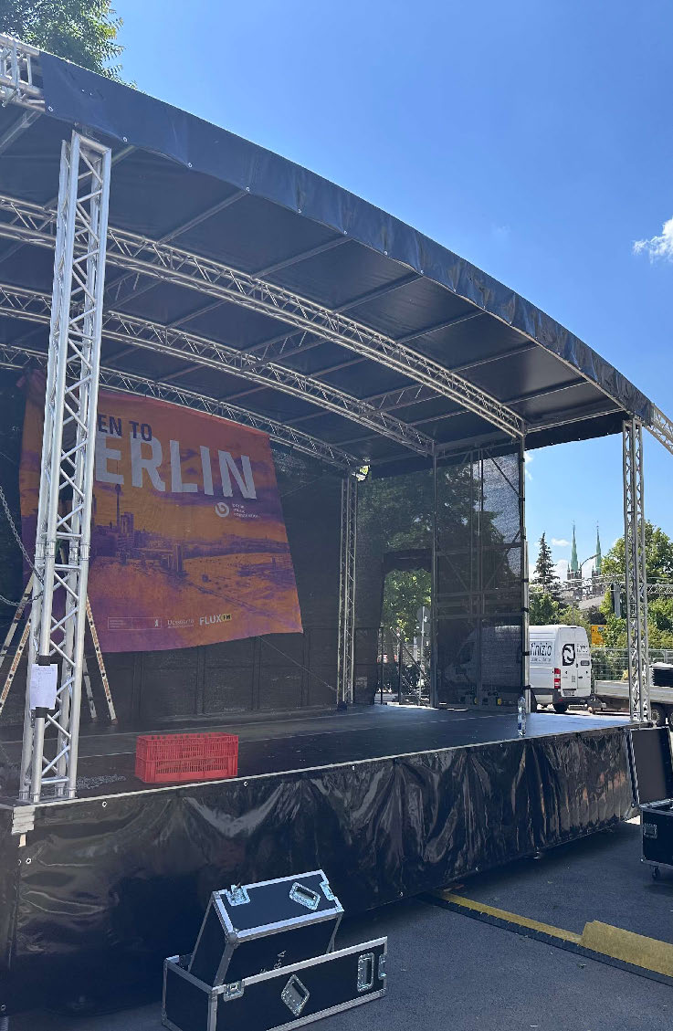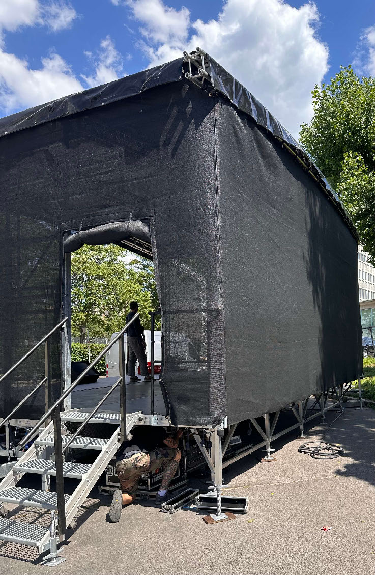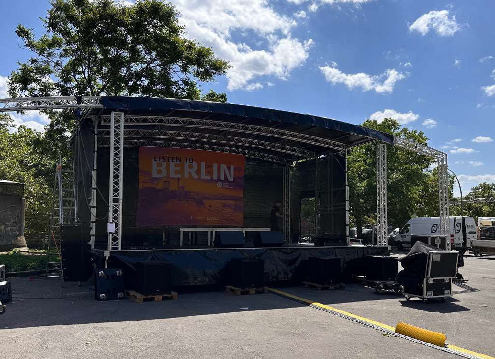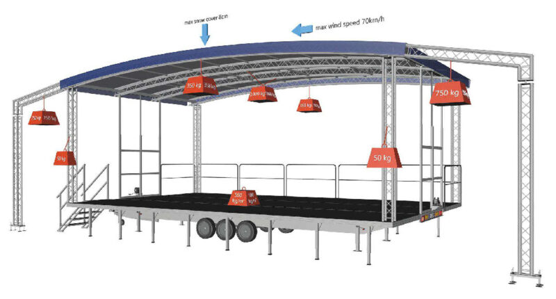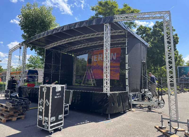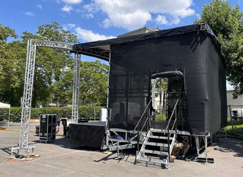 Diese Runddachbühne misst 8×6 Meter und bietet eine robuste, wetterfeste Konstruktion. Ideal für Events, Konzerte und Messen. Schneller Aufbau, hohe Stabilität und attraktives Design für professionelle Auftritte. Mit Sidewings beträgt die Bühne 12x6m.
